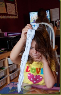 She worked on her cutting and numbers in some of her Kumon books. She worked really hard to try and cut those short lines. It was a challenge for her.